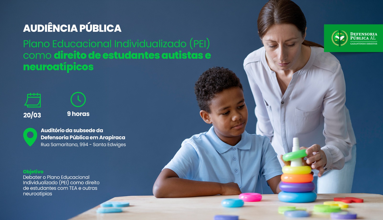 A Defensoria Pública do Estado de Alagoas (DPE/AL) realizará, nesta sexta-feira (20), uma audiência pública para debater o acesso ao Plano Educacional Individualizado (PEI), instrumento fundamental para garantir a inclusão e o desenvolvimento educacional de estudantes autistas e demais neuroatípicos. A iniciativa foi proposta pela defensora pública Brígida Barbosa e tem como objetivo assegurar o direito dessa população ao PEI.