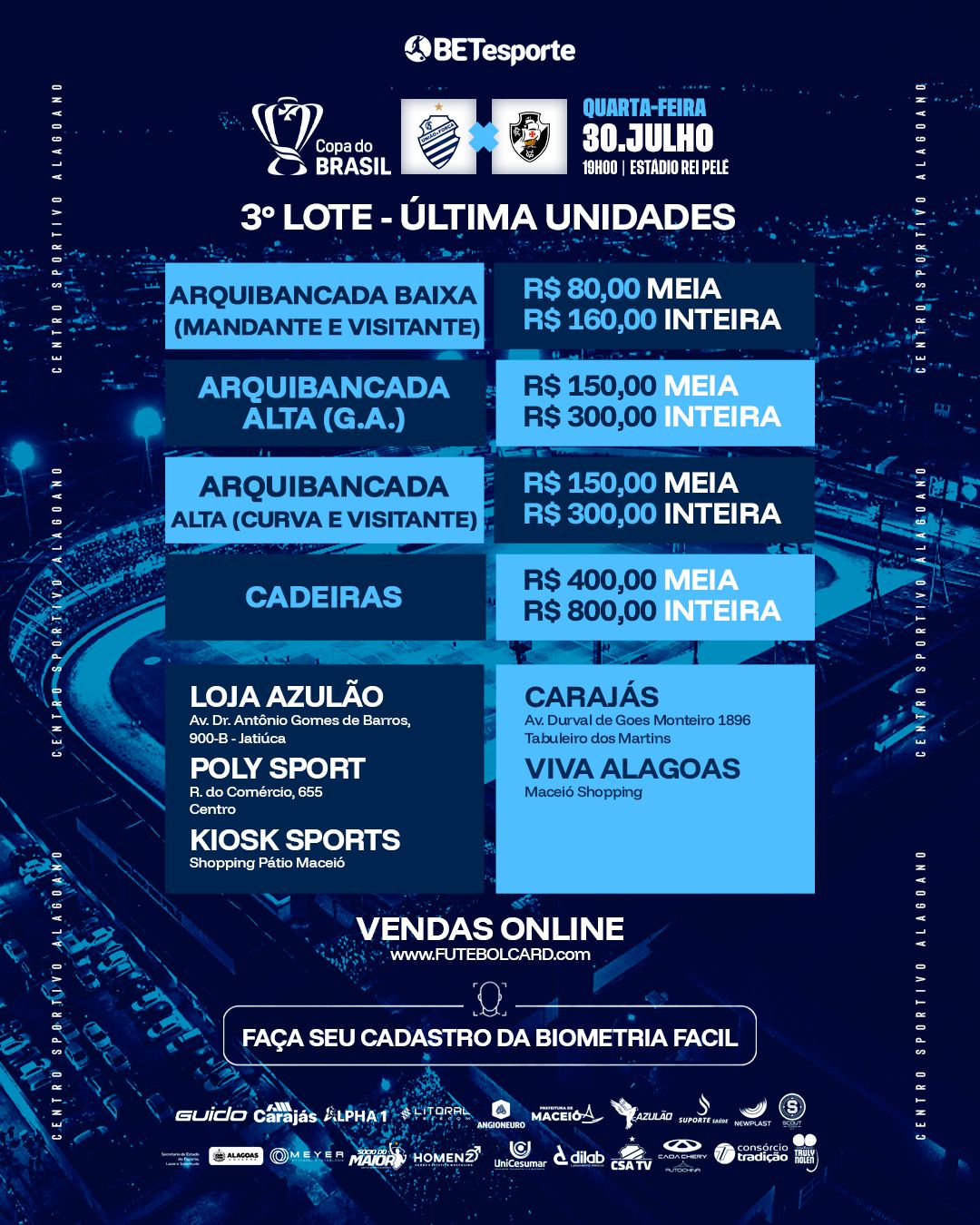 Um novo lote de ingressos para o jogo entre CSA x Vasco pela Copa do Brasil, marcado para o dia 30 de julho, no estádio Rei Pelé, será colocado a venda nesta sexta-feira, dia 20 de junho, nos postos de vendas e no site futebolcard.com. o 3º lote apresenta também novos valores como foi divulgado pela assessoria de comunicação do clube na tarde de hoje. A vendagem, será iniciada às 8horas.