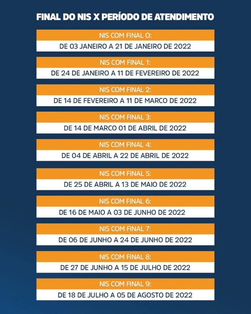 Ao todo, 76.063 usuários devem atualizar seus dados em 2022. Para quem tem o NIS com final 0, o atendimento acontecerá de 3 a 21 de janeiro. Para aqueles com NIS com final 1, o recadastramento acontecerá de 24 de janeiro a 11 de fevereiro. Para quem tem o NIS com final 3, o atendimento será de 14 de março a 1º de abril.
